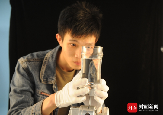 “主角”选定,接下来是泡茶。带上白手套,拿出一个玻璃杯,用专用毛巾反复擦拭,放入茶叶,倒入温水。“和我们平时喝茶不同,拍摄时,我们用温水,这样一来,不会破坏茶叶的颜色,更加好看。”任元说。