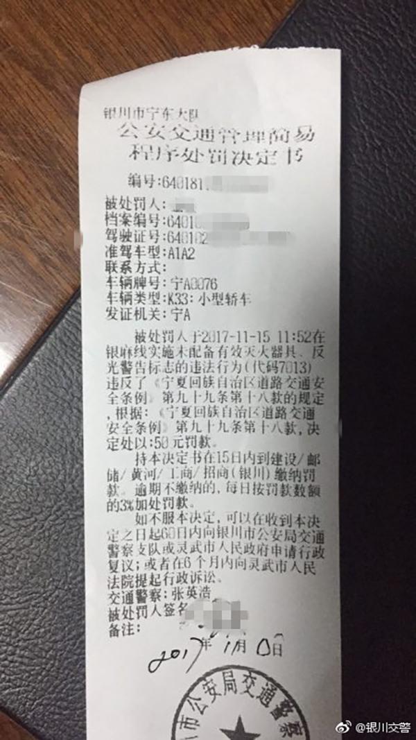 银川市公安局交通警察支队今天就此发布了“知错能改”的通告,通告中称,事发后,宁东交警大队对宁A0076警车驾驶员进行了处罚。在银川交警发布的罚单照片中可以看到,罚单上写有涉事警车的牌照和经马赛克处理的被处罚人姓名。被处罚人因2017年11月15日11:52在银麻线实施未配备有效灭火器具、反光警告标志的违法行为。根据《宁夏回族自治区道路交通安全条例》,决定处以50元罚款。