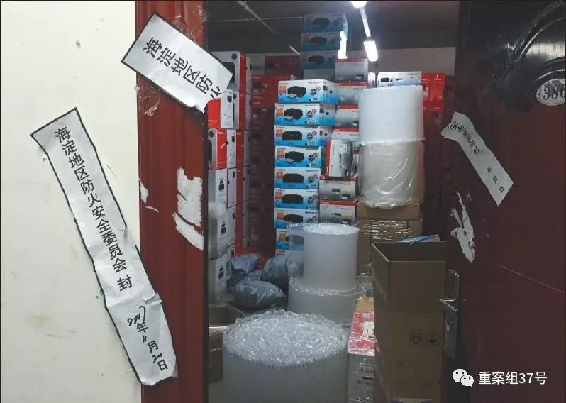 截至11月28日,王志勇租用的中关村广场公园地下三层350号仓库,已贴着四张封条,其中有三张属于北京市海淀地区防火安全委员会,一张为天佑万荣物业公司所贴。