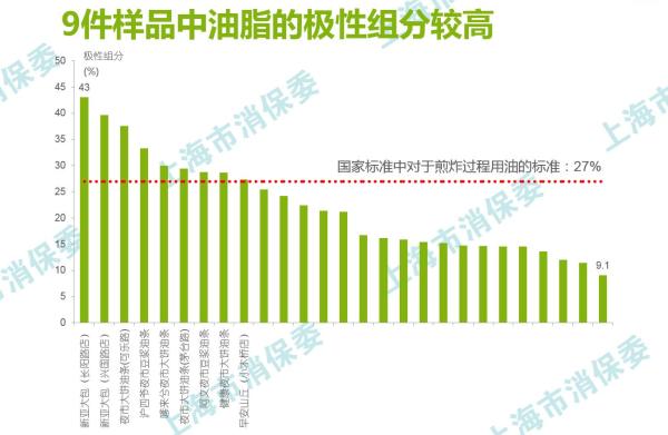 有9件样品中油脂的极性组分较高,其中,新亚大包长阳路店油脂极性组分最高、达到了43%,新亚大包兴国路店的极性组分也高达39.6%。