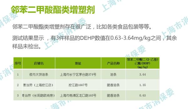 在29件油条样品中,有3件样品被检出邻苯二甲酸酯类增塑剂,也就是俗称的塑化剂,分别来自茅台路上的夜市大饼油条、麦当劳上海控江店、麦当劳长阳路欧尚店。