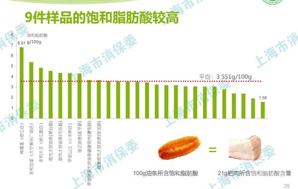 此外,29件样品中,部分样品的饱和脂肪酸含量较高。来自肯德基控江路店的油条饱和脂肪酸含量为6.81g/100g,也就是说,100克所含饱和脂肪酸相当于21克肥肉。