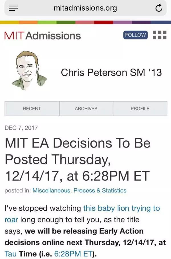 “MIT招生官网截图:今年提前录取发榜时间为2017年12月14日,下午6时28分”