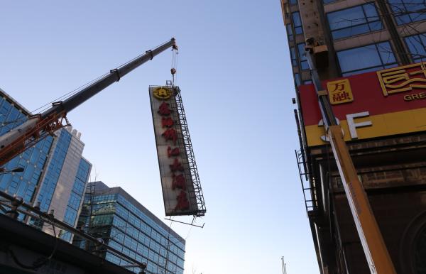 2017年11月28日,北京,建国门相关部门拆除鑫海锦江大酒店东南侧广告牌匾。 东方IC 图