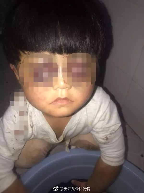 受虐女孩双眼臃肿呈现紫色,其中右眼无法睁开本文图片均来自微博@贵阳头条排行榜