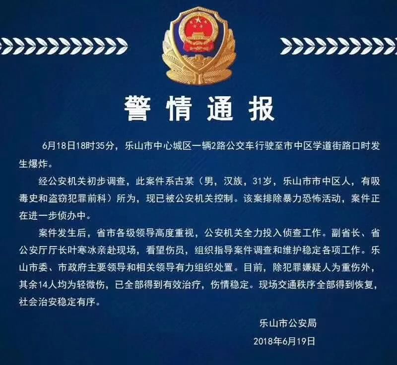 根据乐山市公安局通报,6月18日18时35分,四川省乐山市中心城区一辆2路公交车,行驶至市中区学道街路口时发生爆炸。经公安机关初步调查,此案件系古某(男,汉族,31岁,乐山市市中区人,有吸毒史和盗窃犯罪前科)所为,现已被公安机关控制。该案排除暴力恐怖活动,案件正在进一步侦办中。