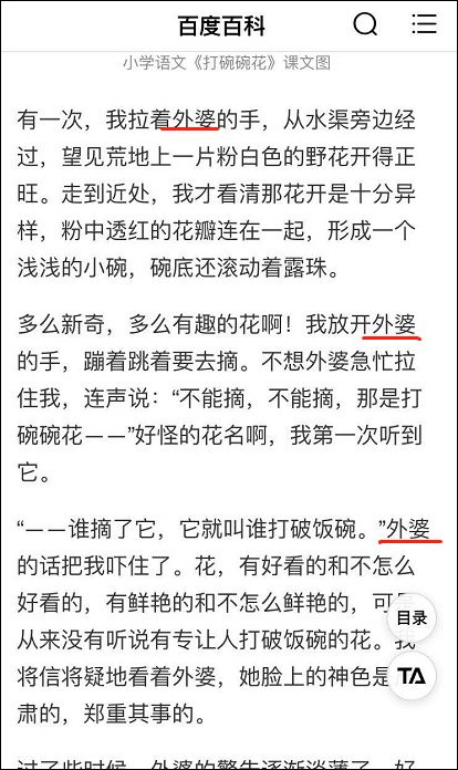 微博网友@小阿_小圆圆补充道,同一本教材的第6课《马鸣加的新书包》,也全部用的“姥姥”这一表述。