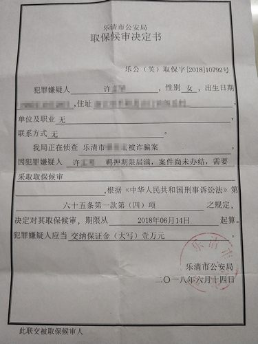 随后,王先生在这份《取保候审决定书》上才得知,他的妻子是涉嫌乐清某桩信贷诈骗案,因为30天期满采取取保候审,这和中间人陈某所说基本一致。