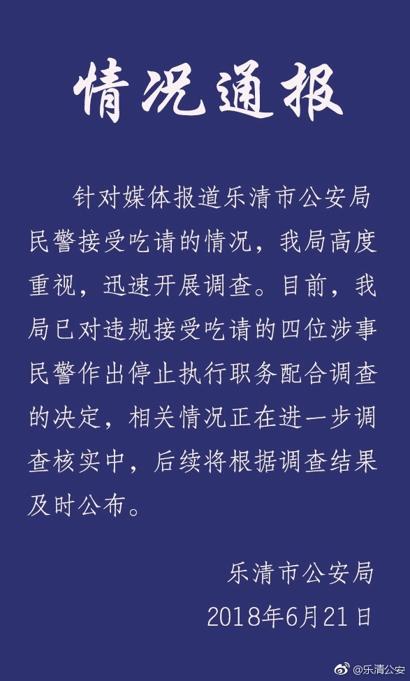 6月21日凌晨,乐清市公安局发布情况通报称:6月20日晚,有媒体报道乐清市公安局民警接受相关人员吃请,得知情况后,乐清警方高度重视,立即成立调查组,对反映的情况展开深入的调查。公安机关将根据查明的事实,不枉不纵,绝不护短,即使公布调查情况,接受公众监督,并依法依规作出严肃处理。