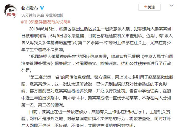 @临淄发布6月22日消息,2018年6月5日,淄博市临淄区临园生活区发生一起故意杀人案,犯罪嫌疑人秦某某当日被刑事拘留,6月9日被依法逮捕,目前已移送检察机关审查起诉。近期,有“杀人者父母找关系做精神病鉴定”及“第二名杀第一名”等网上信息在社会上、尤其在青少年学生中造成不良影响。