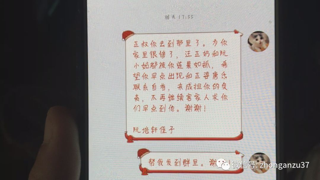 11岁侄子知道此事后和阮母一起写下了一则“投案自首通知”,让别人发到群里帮他转发。“通知”内文喊话阮汉平:“你去哪里了,家里为你已经很惨了,家人都被你连累被抓,希望你早日出现自首,来承担你的责任,不要继续害家人,求你了。”侄子告诉重案组37号探员,写下这个“通知”是想让阮汉平知道现在家里的现状,早日自首。