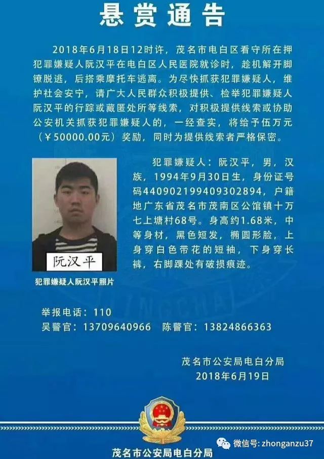 20日中午,电白区公安分局发布悬赏通报称,18日12时许,茂名市电白区看守所在押犯罪嫌疑人阮汉平在电白区人民医院就诊时,趁机解开脚镣脱逃,后搭乘摩托车逃离。
