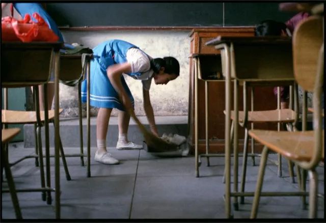 放学时分,人去楼空,教室往往只剩下一张张书桌,地上还有淡淡的水迹未干—— 这是女生在扫地之前往地上洒的水,如果是男生,肯定就乌烟瘴气了。