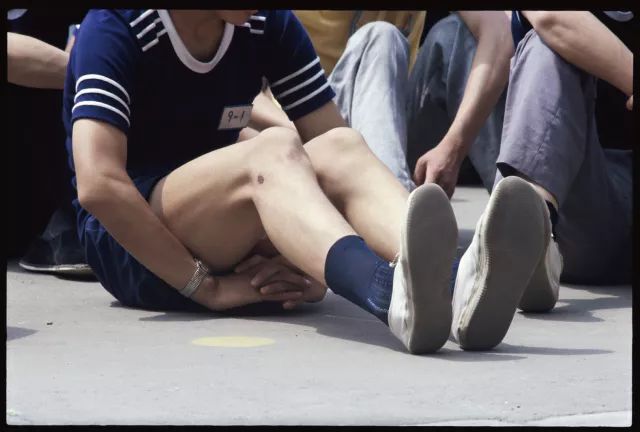 1984年,在篮球场边读书的女生。