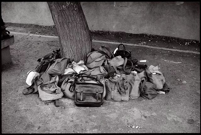 北京第143中学,堆在考场外的书包。