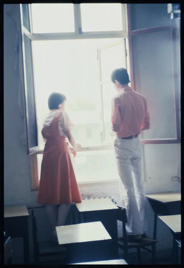 初夏,男孩女孩倚在课室窗前。