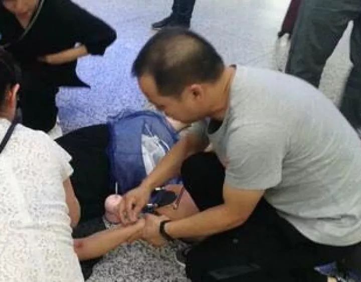 随后,广播里便开始寻找医生帮忙。一名正在候车大厅等待检票的大叔听到广播通知后,马上跑了过去。