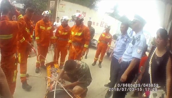 民警、消防官兵合力将男子“五花大绑”救下,并送医治疗。 图片来源:镇宁公安局